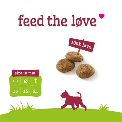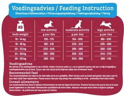 Samenstelling: Kippenmeel (20%), mais, gerst, sorghum, kippenvet (gestabiliseerd met natuurlijke tocoferolen), verse kip (4%), lamsmeel (4%), rijst, bietenpulp, gehydroliseerd eiwit, cellulose (2,5%), MSC-gecertificeerde vismeel (2%)*, biergist, MSC-gecertificeerde visolie (0,8%)*, cichorei (0,7%), vitamine en mineralen mix (bevat natriumhexametafosfaat 0,1%), glucosamine (0,03%). *Uit een MSC gecertificeerde duurzame visserij