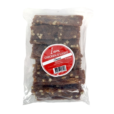I Am Chicken D'Light Cheese is een snack voor honden, gemaakt van kipfilet en kaas. Deze eiwitrijke traktatie is ideaal als beloning of tussendoortje en geschikt voor honden van verschillende formaten.